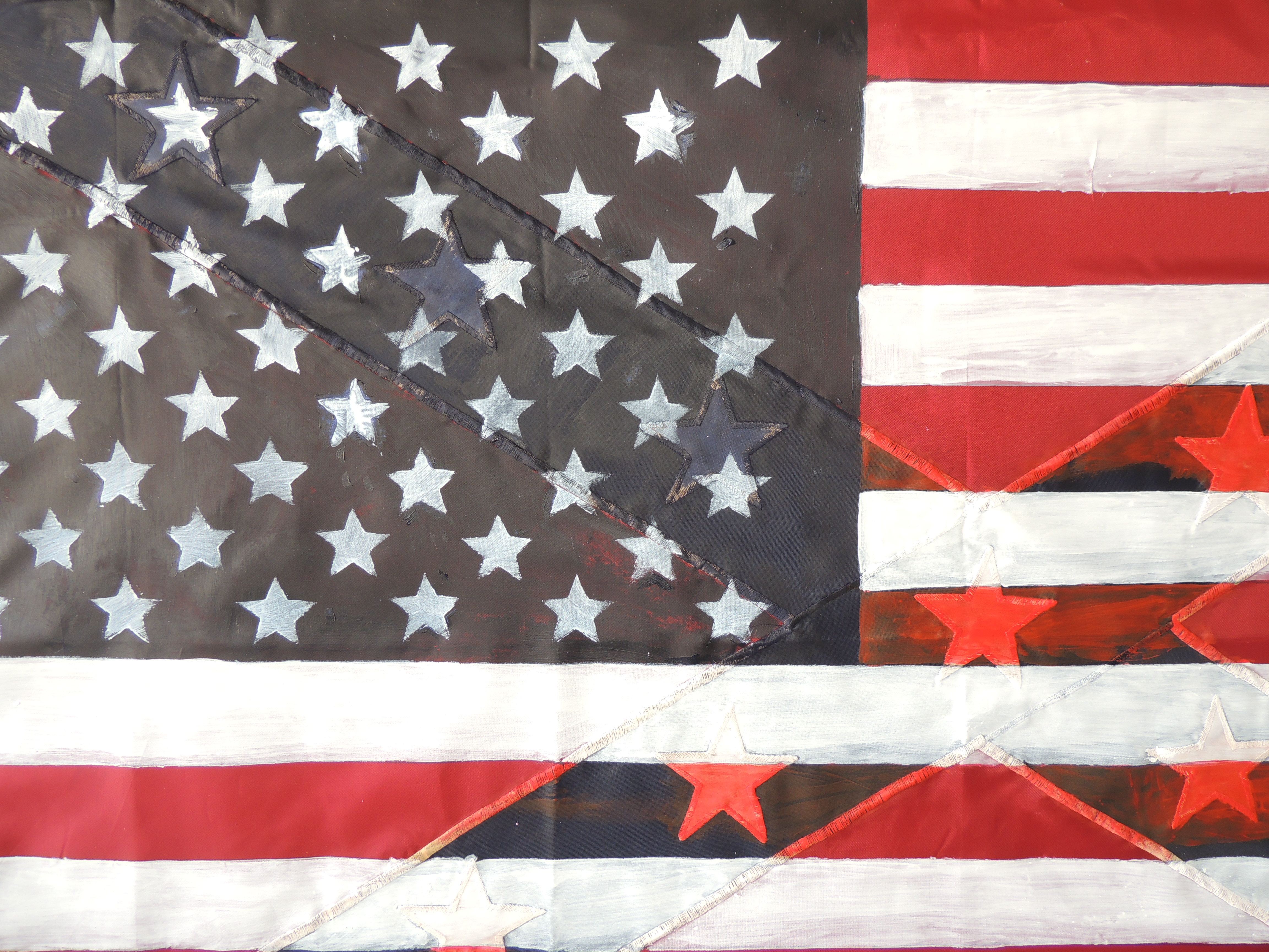 Hidden in plain sight is an acrylic painting on a confederate flag disgusting as a typical American flag. When displayed on a flagpole, the confederate stiching design is almost completely unrecognizable. The purpose of this painting is to reward the viewer who decides to take a closer look. The repainted flag is a comparison of the American society and educational system. Racism is still here and hidden in plain sight. For those who are privileged enough not to experience it, after taking a closer look and educating themselves, they are more likely to understand, sympathize and fight against injustice.